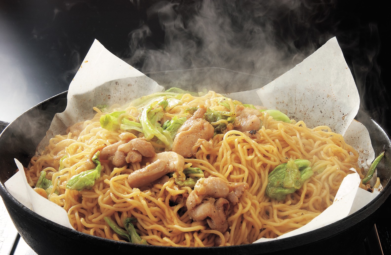 食事の最後を飾るのは、杉の子名物の焼きそばです。鍋の底に残った旨みたっぷりのタレをしっかりと絡めて焼き上げることで、絶品の「おこげ」まで堪能することができます。最後まで余すことなく、杉の子のこだわりを味わい尽くしていただけます。